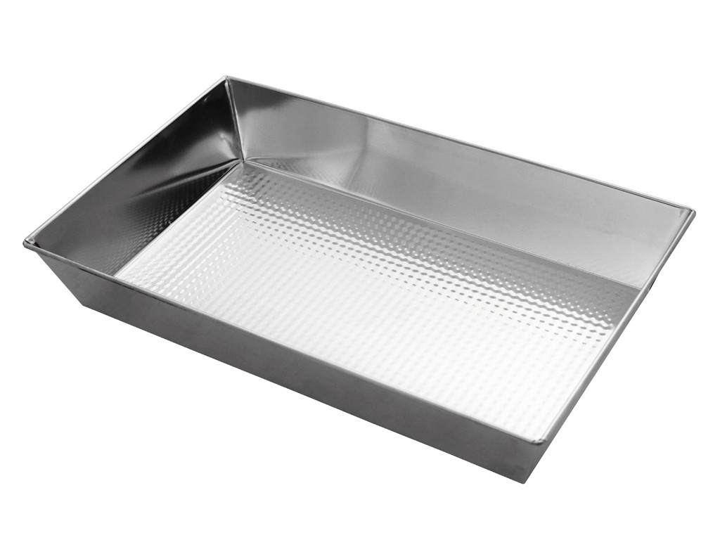 Fakturowana blacha do ciast o wymiarach 39x23,5x7 cm. Wykonana z wysokiej jakości blachy ocynowana elektrolitycznie. Kształt prostokątny. Gramatura 0,4 kg.