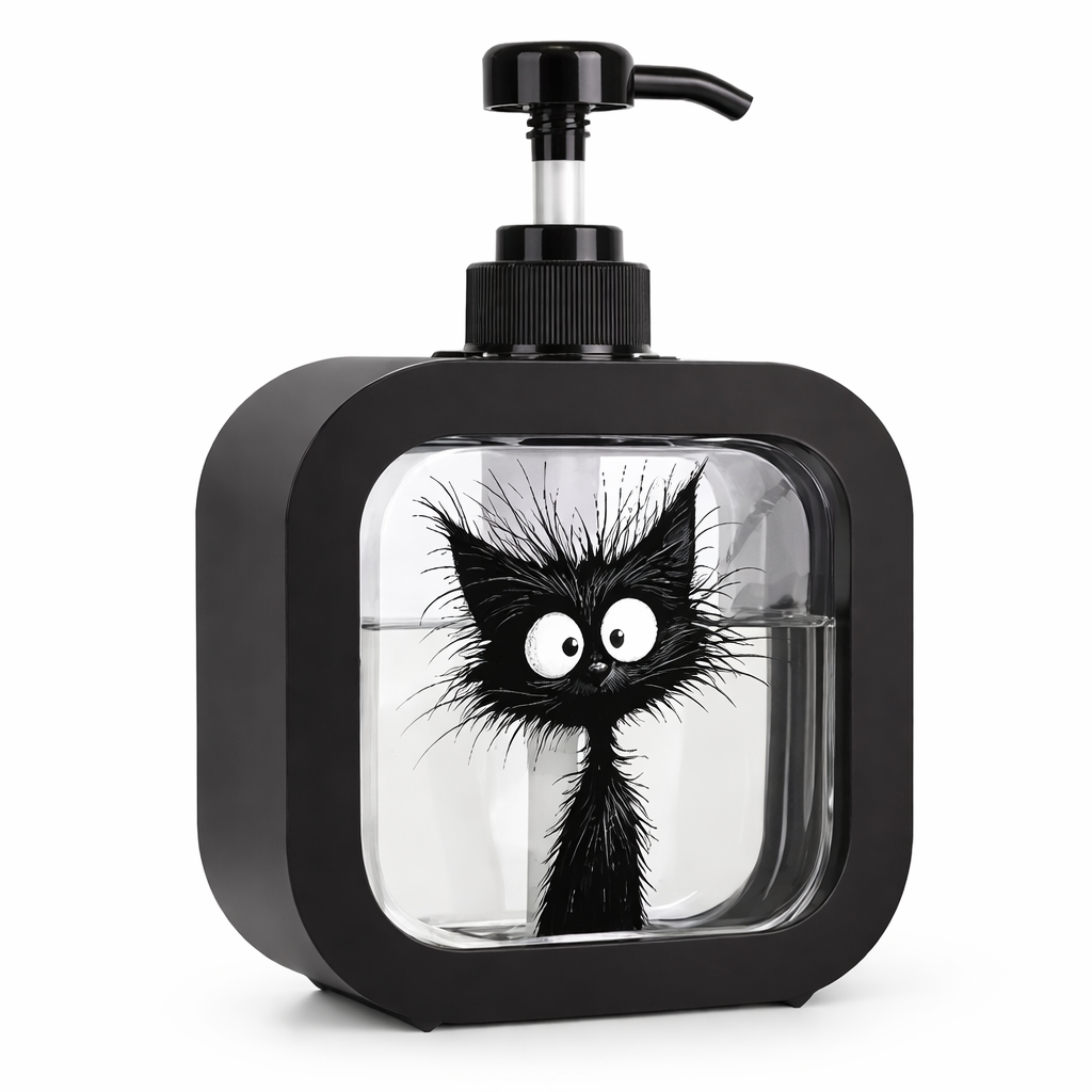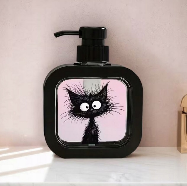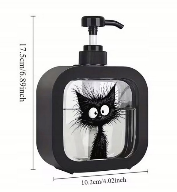 ❤️Elegancki przezroczysty dozownik na mydło w kolorze czarnym z pompką w nowoczesnym wydaniu z uroczym, rozczochranym komiksowym czarnym kotkiem z zabawnym spojrzeniem o pojemności 300ml ❤️