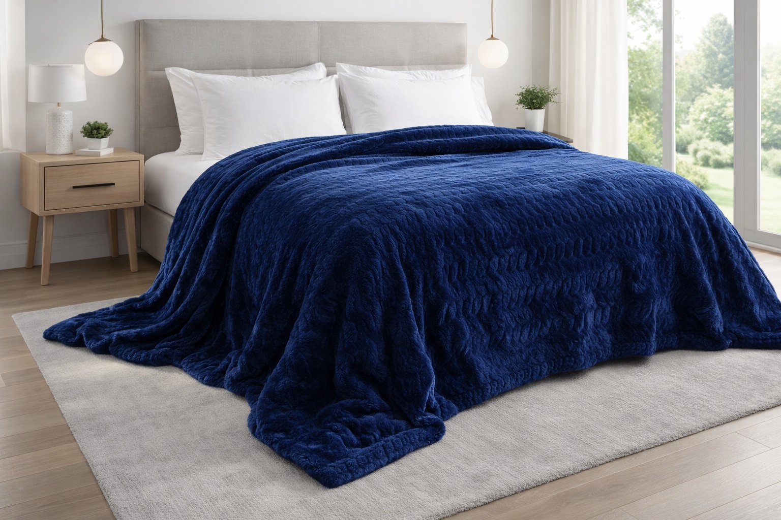 Koc Erlla w głębokim odcieniu granatu to idealne połączenie komfortu, funkcjonalności i stylu. Dwustronna konstrukcja – miękka, aksamitna mikrofibra z obu stron – zapewnia wyjątkowe ciepło i przyjemność użytkowania, szczególnie w chłodniejsze dni. To doskonały wybór do salonu, sypialni lub jako prezent.