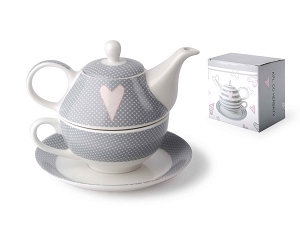 Uroczy komplet do herbaty typu "tea for one" z serii Amelie. Zestaw składa się z imbryka, filiżanki oraz talerzyka. Seria Amelie została stworzoną z myślą o wypełnieniu przestrzeni romantycznymi dodatkami. Zdobią ją szarości, biel oraz delikatny róż w postaci serduszka. Dodatkowego uroku dodają jej białe, drobne kropeczki. Cała linia Amelie jest bardzo spójna. Wspaniale będzie się komponowała zarówno w tradycyjnych jak i nowoczesnych wnętrzach.