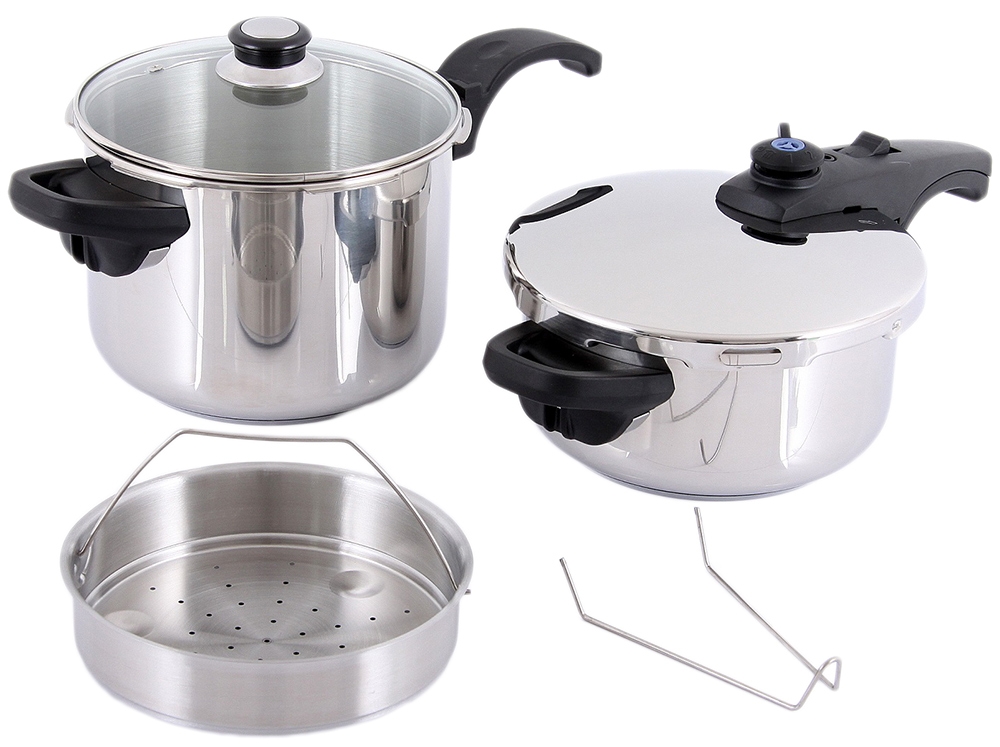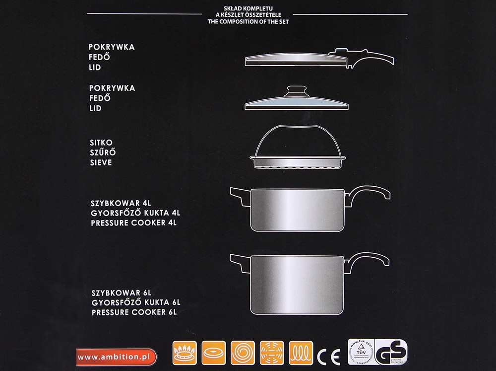 | Zestaw zawiera | szybkowar 6L + szybkowar 4L + sitko + pokrywa + pokrywa szklana. |