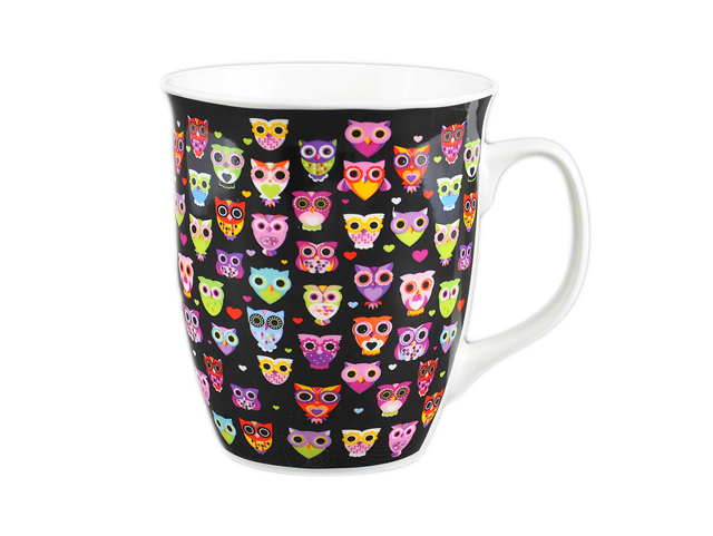 Duży kubek z kolekcji firmy ANLUX wykonany z dobrej jakości porcelany New Bone China, zdobiony motywem kolorowych sówek.