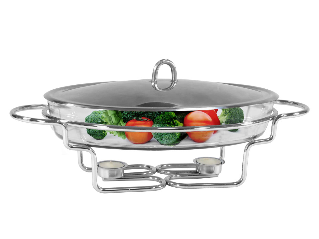 Żaroodporne naczynie z podgrzewaczami i chromowaną pokrywą, na stalowym stojaku. W szklanym, żaroodpornym naczyniu możemy piec lub podgrzewać potrawy w piekarniku lub kuchence mikrofalowej, jak rownież schładzać je i mrozić.