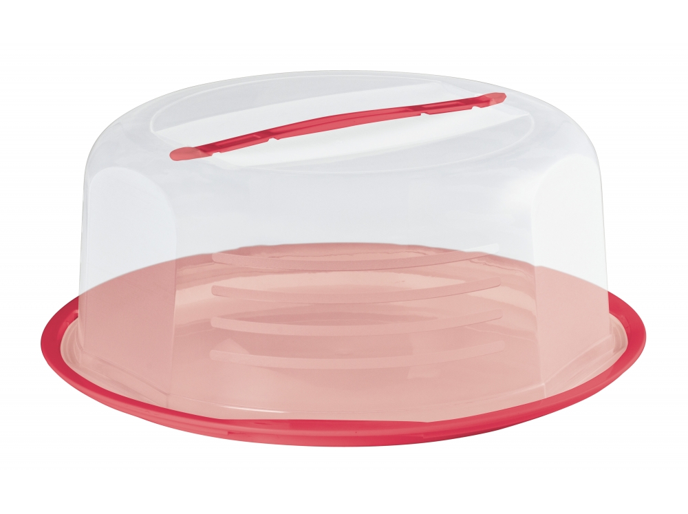 Pojemnik o średnicy 30 cm do przechowywania, transportu i serwowania wypieków. Podstawa i uchwyt pojemnika w kolorze czerwonym. Wygodny uchwyt ułatwi przenoszenie. Dzięki niemu wypieki, kanapki i przekąski dłużej zachowają świeżość. Idealnie nadaje się na kuchenny blat, do lodówki lub do szafki.