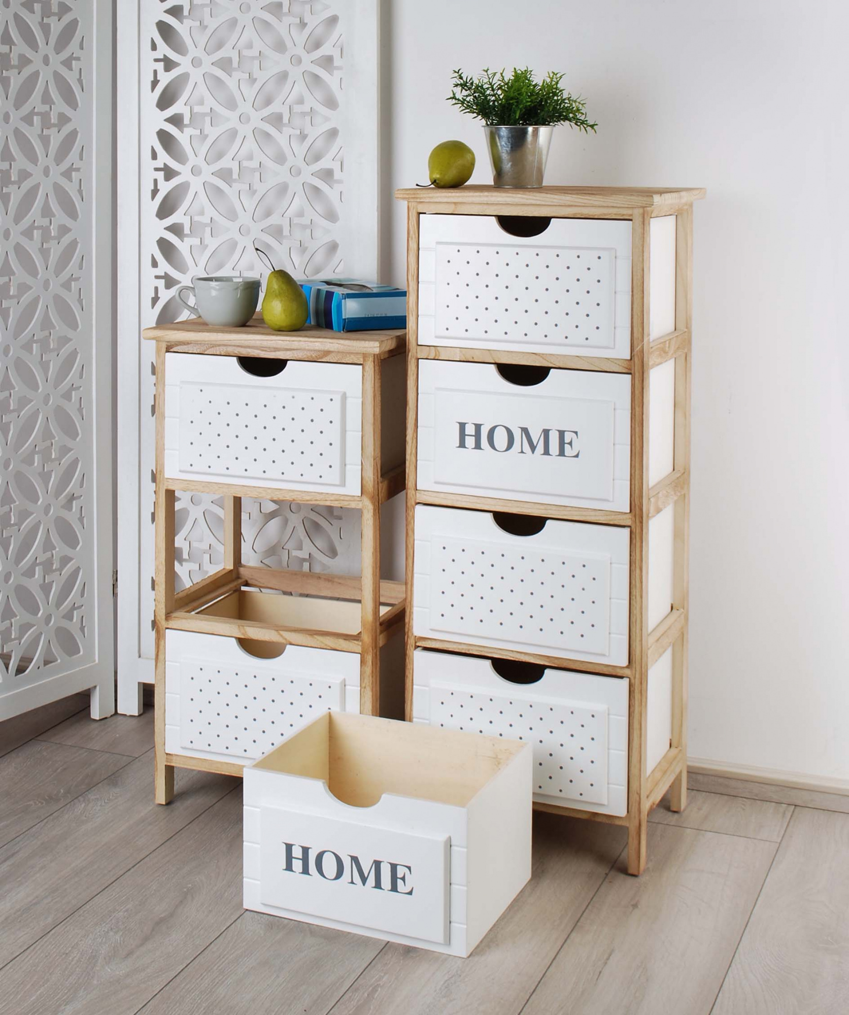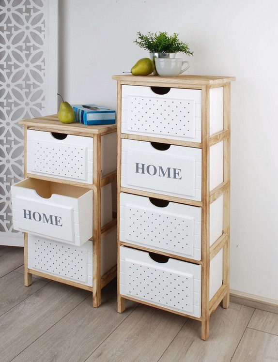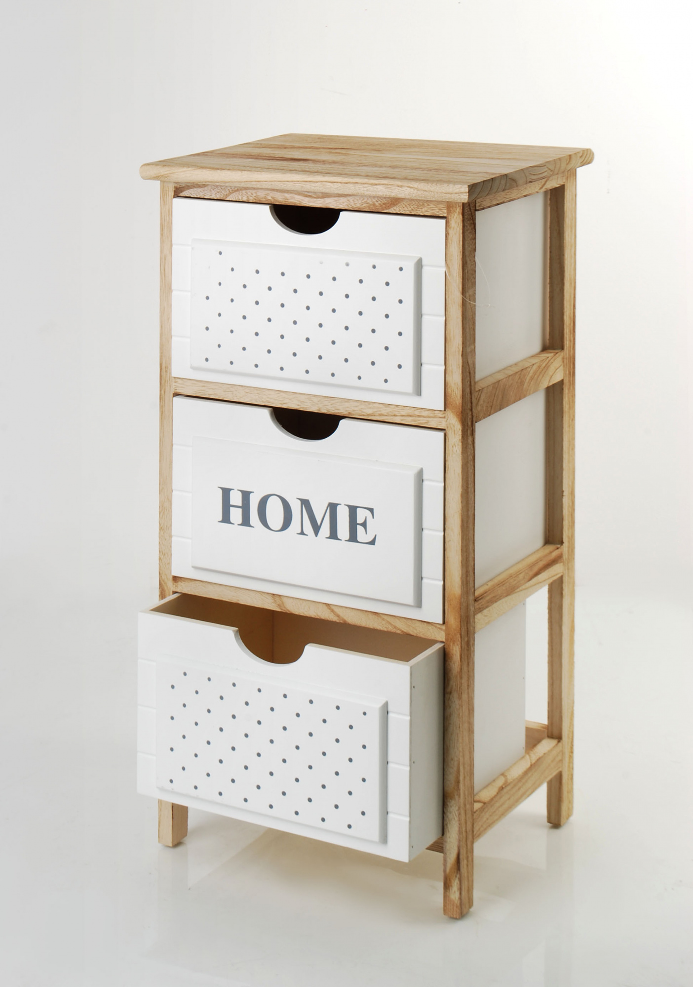 Drewniana szafka OLY posiada 3 szuflady - dwie zdobione kropkami a jedna napisem HOME. Idelanie nadaje się do sypialni lub przedpokoju.