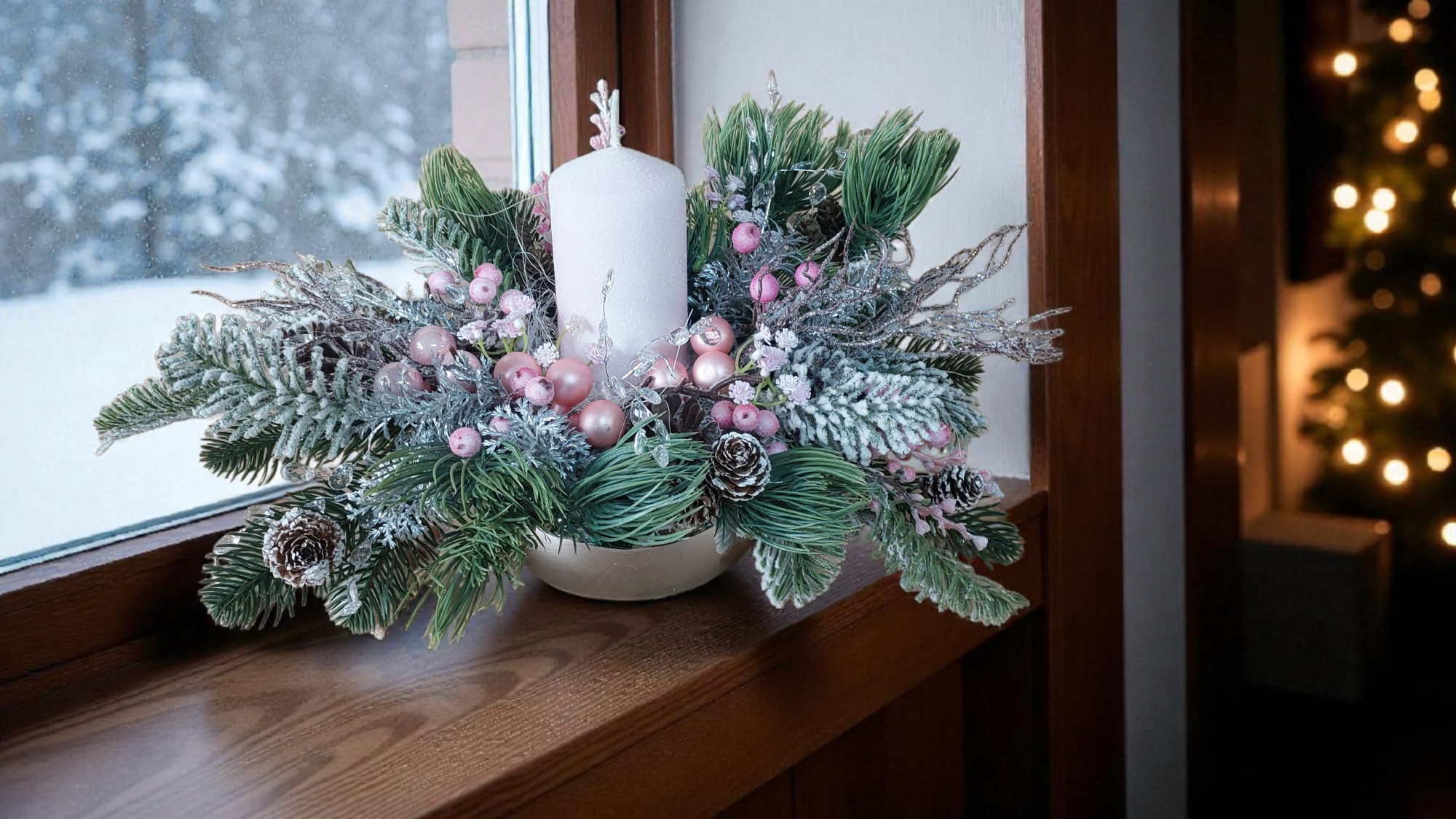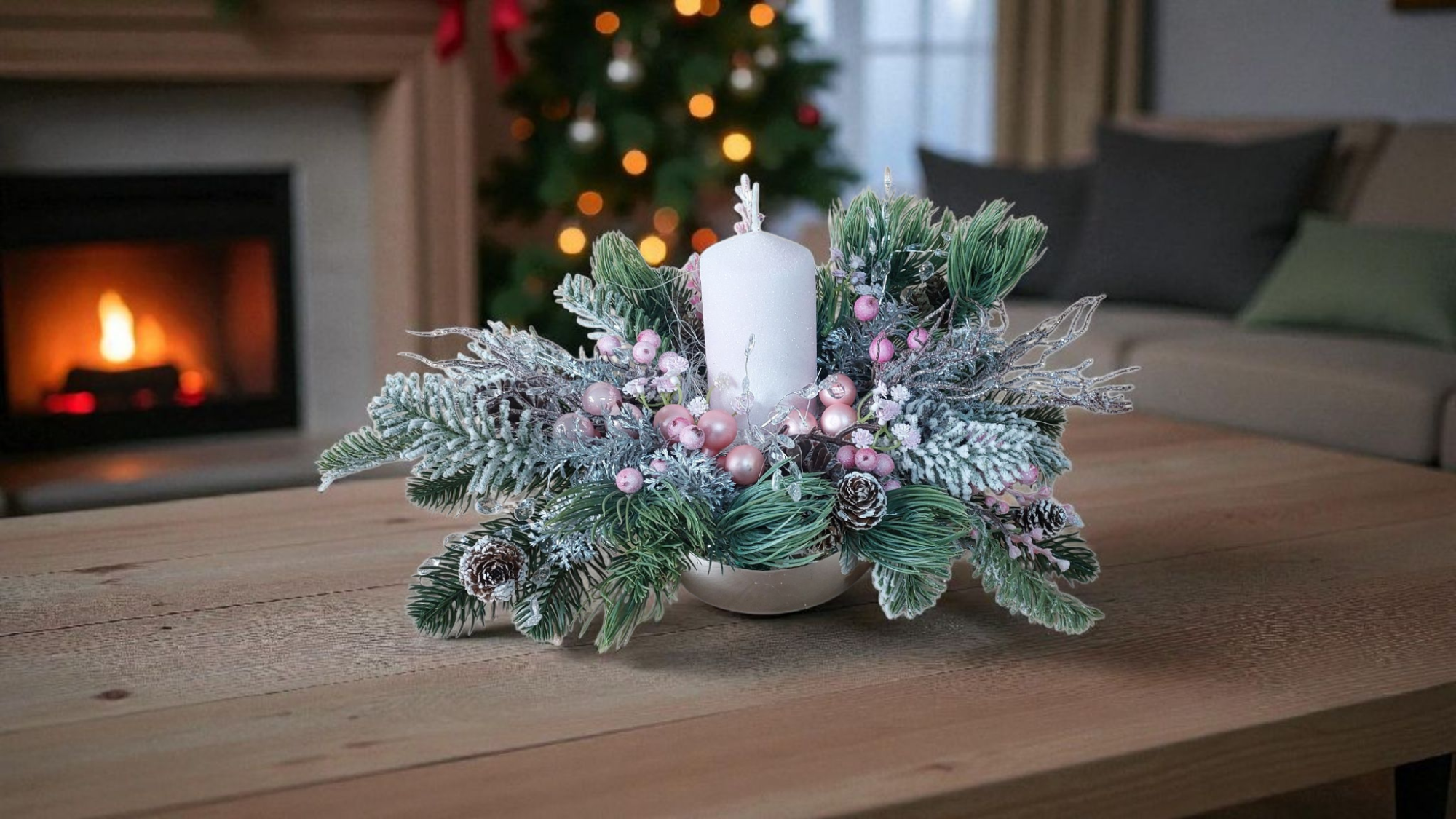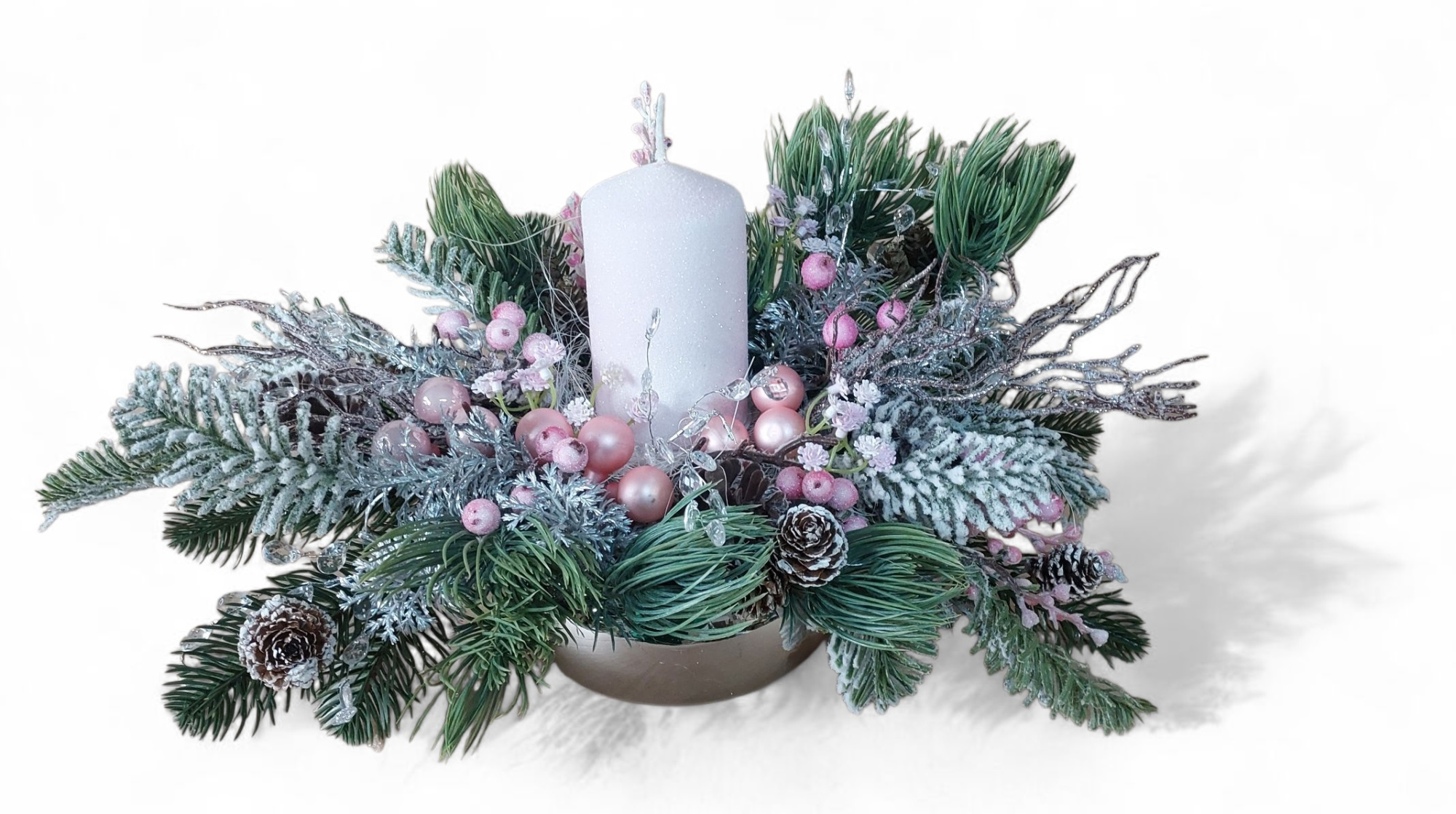 Świąteczna dekoracja została wykonany przez Nas ręcznie z najwyższej jakości materiałów: pięknych bombek z nietłukącego szkła, sztucznych kwiatów wysokiej jakości oraz uroczych dwóch figurek.  Wszystko utrzymane w eleganckiej i zimowej biało-różowej kolorystyce,