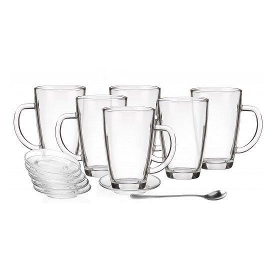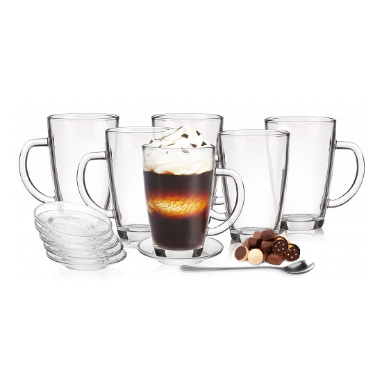 Szklanki, jak i spodki wykonane są z wysokiej jakości szkła zapewniają dużą wytrzymałość i doskonałość, a do tego dołączone zostały długie łyżeczki. Przydatny zestaw podczas gustowania ulubionego gorącego napoju. Delektuj się smakiem, a dodatkowo zabłyśnij nowością wśród znajomych.