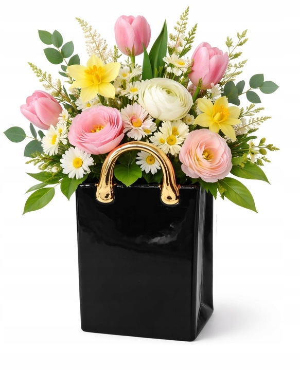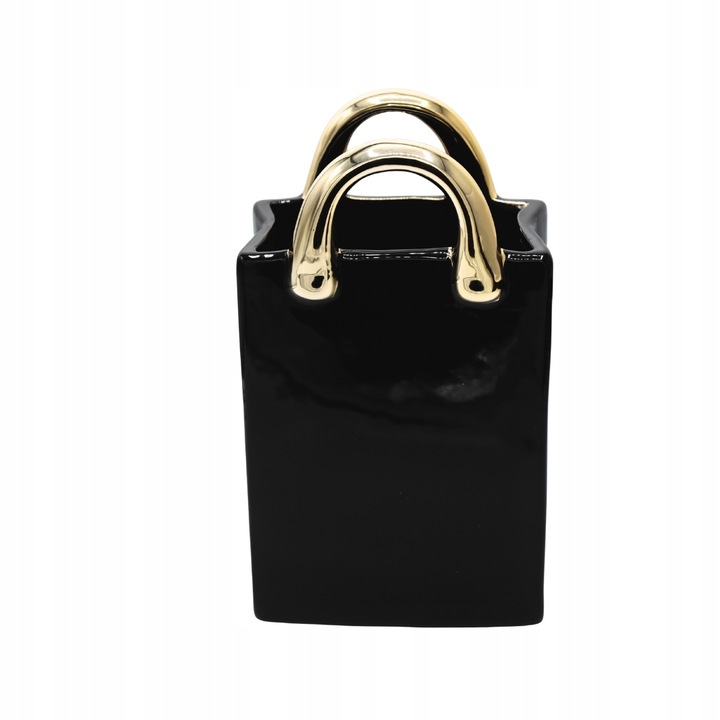 Elegancki wazon dekoracyjny w oryginalnym kształcie torebki, wykonany z ceramiki w kolorze czarnym z ozdobnymi złotymi uchwytami. Nowoczesna forma sprawia, że produkt stanowi efektowną dekorację zarówno w klasycznych, jak i nowoczesnych wnętrzach.