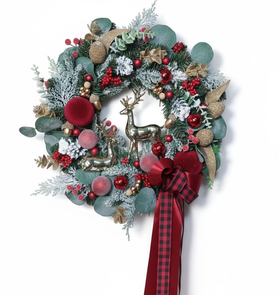 Ten efektowny wieniec został wykonany z dbałością o każdy detal – ozdobiony jest gałązkami świerku pokrytymi delikatnym szronem, czerwonymi i złotymi bombkami, jagodami, szyszkami oraz połyskującymi liśćmi eukaliptusa. Centralnym elementem dekoracji są dwa złote renifery, które dodają całości elegancji i blasku. Całość wieńczy piękna, satynowa kokarda w odcieniach czerwieni z ozdobną wstążką w kratkę.