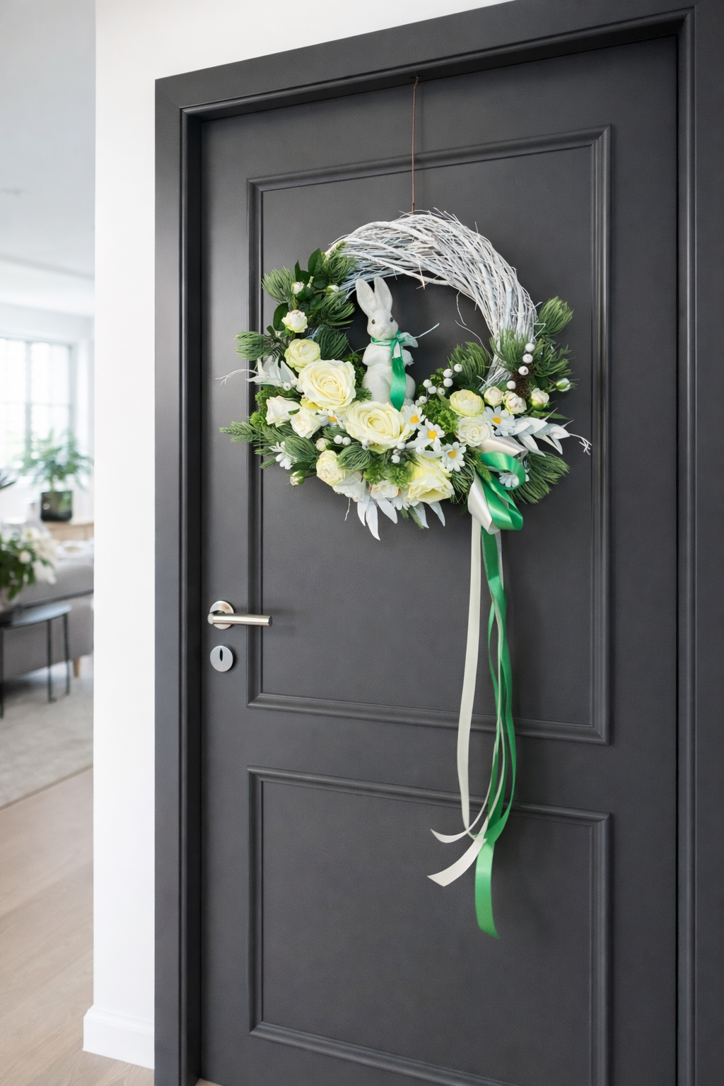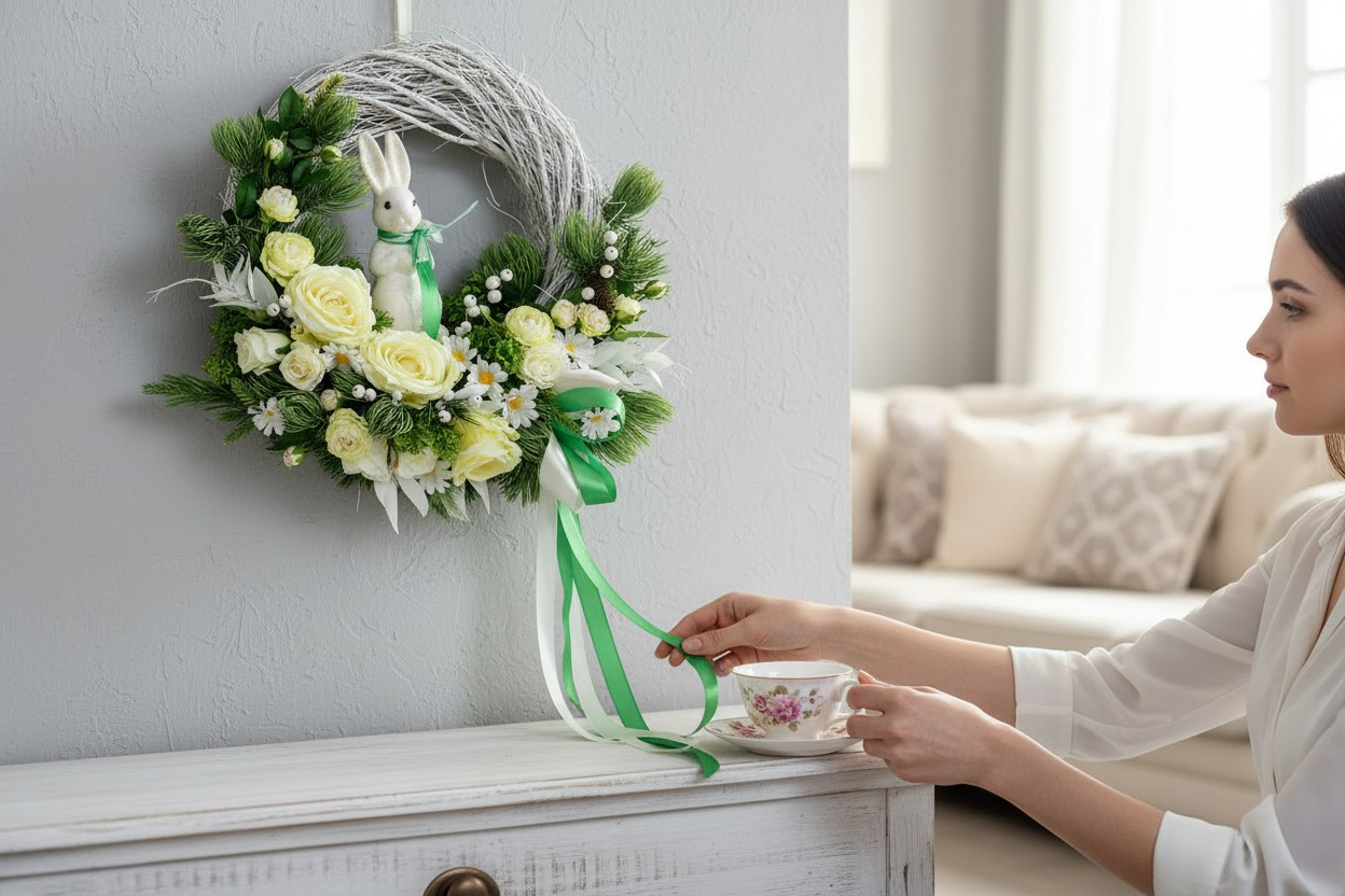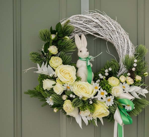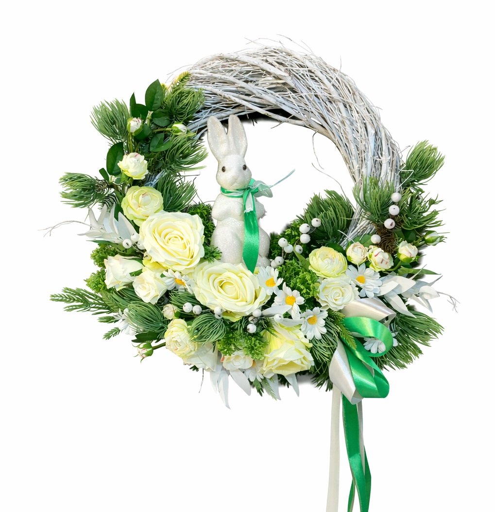 Wprowadź do swojego domu wiosenną świeżość i świąteczny klimat dzięki wyjątkowemu wiankowi dekoracyjnemu. Ta starannie wykonana kompozycja zachwyca naturalnym wyglądem, harmonijną kolorystyką oraz uroczym detalem w postaci białego króliczka – subtelnym symbolem wiosny i Wielkanocy.