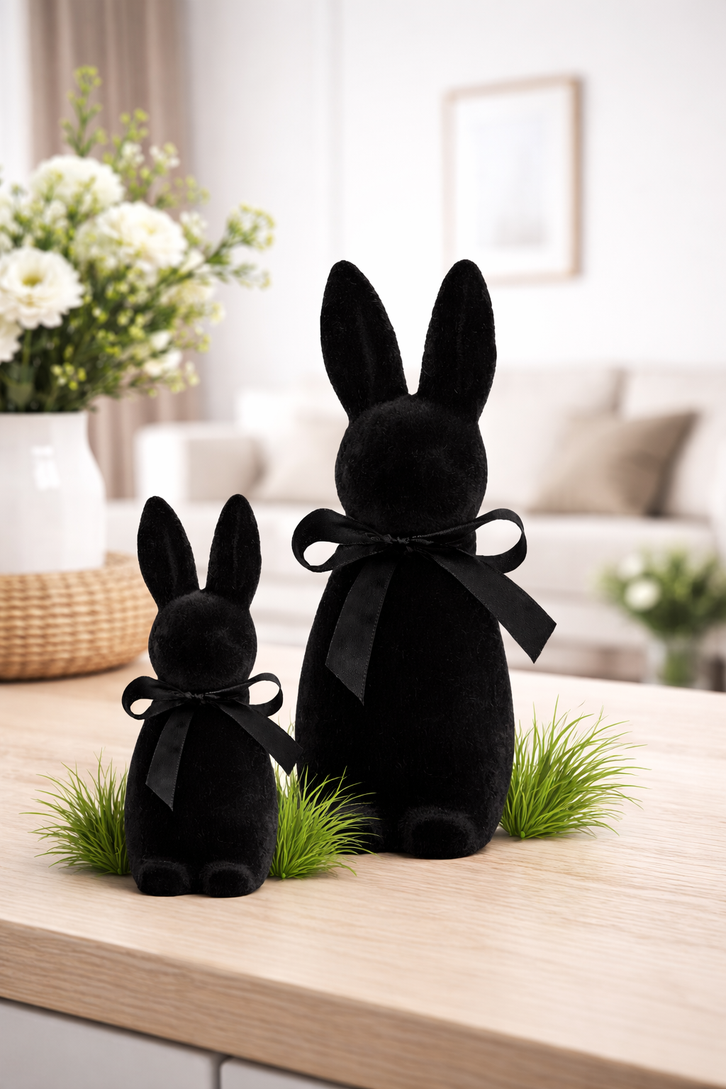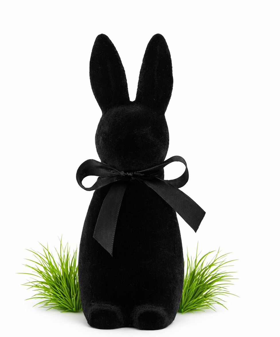 Elegancki, minimalistyczny zając dekoracyjny wykonany z miękkiego, matowego weluru. Stylowa czerń w połączeniu z subtelną satynową kokardą sprawia, że dekoracja doskonale wpisuje się w nowoczesne, loftowe oraz klasyczne wnętrza. Idealny jako ozdoba całoroczna lub element aranżacji wiosenno-wielkanocnej.