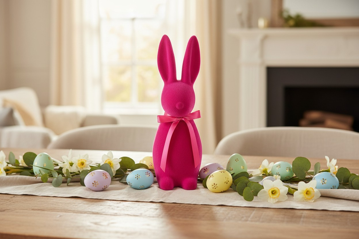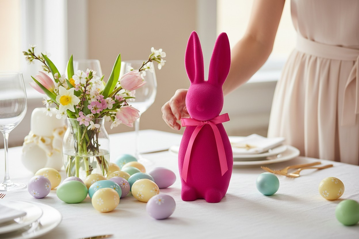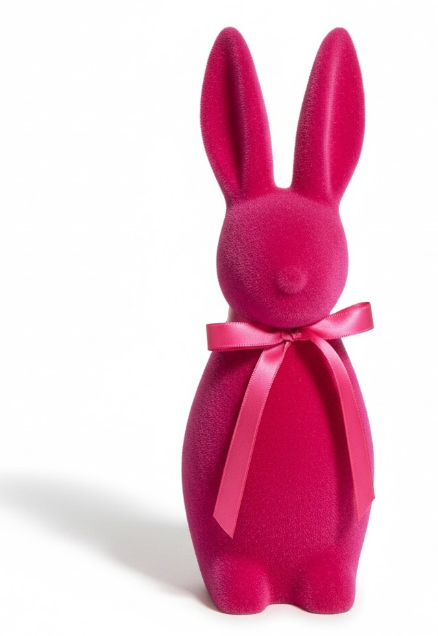 Elegancki, minimalistyczny zając dekoracyjny wykonany z miękkiego, matowego weluru. Stylowy róż  w połączeniu z subtelną satynową kokardą sprawia, że dekoracja doskonale wpisuje się w nowoczesne, loftowe oraz klasyczne wnętrza. Idealny jako ozdoba całoroczna lub element aranżacji wiosenno-wielkanocnej.